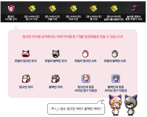 The Pink Bean Item Box can give the Frilly Pink/Black Bean Hat, Frilly Pink/Black Bean Suit (32 to all stats, 2 attack and magic attack, 12 slots), the Pink Bean or Black Bean chair, as well as Pink Bean or Black Bean Riding.