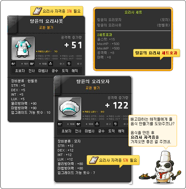 As you complete dishes, you’ll collect Chef’s Qualifications. You can trade 3 in for Tangyoon’s Chef Outfit and 5 for Tangyoon’s Chef Hat. Wear them together and you’ll get the set effect of 15 to all stats, 500 HP and MP, and 8 attack and magic attack.