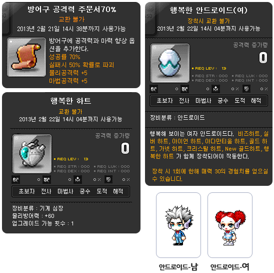 Wow, the 70% scroll for armor gives 5 attack and magic attack! It has a 50% chance of breaking if failed though. You can see what the Happy Androids look like above, and it seems the Happy Heart will expire.