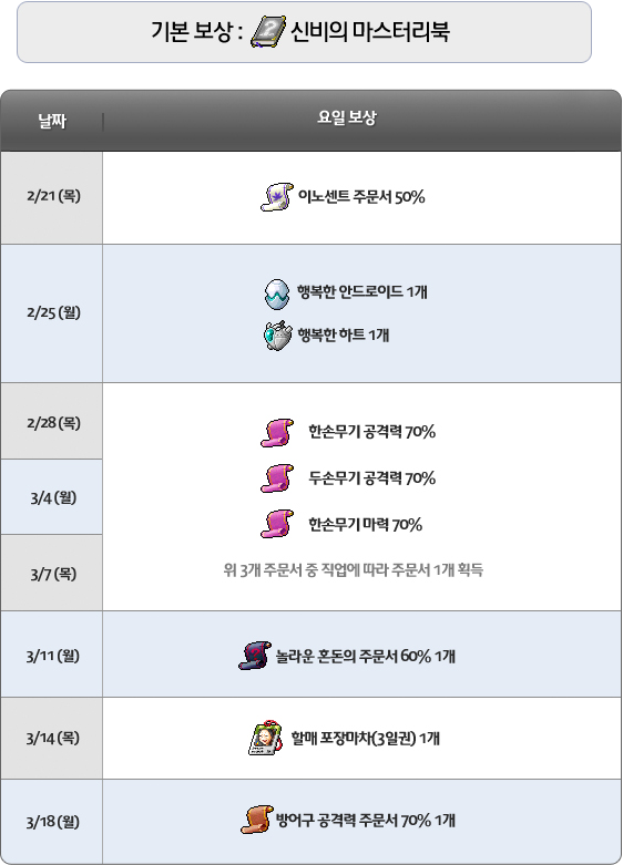 - February 28/March 4/March 7: 70% One-handed/Two-handed Weapon for Attack/Magic Attack Scroll (depending on your class)