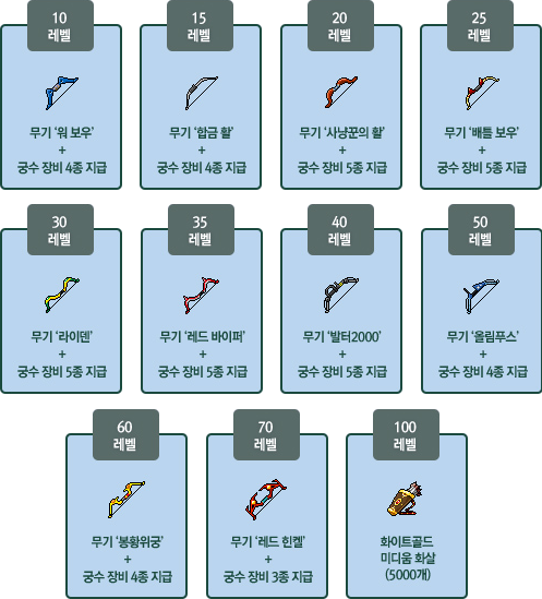 At the levels above, Wind Breakers will receive a bow as well as the entire equipment set~ At level 100, you’ll get 5000 White Gold Medium Arrows. (sort of useless, haha)