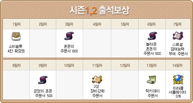 The April Maple Attendance Check King event has begun and will run from April 1 to April 14 (then again from April 15 to April 28). Each day you have to login and kill 200 monsters to be counted. Since the event lasts only 14 days, each day you miss means you will possibly miss out on the later prizes.