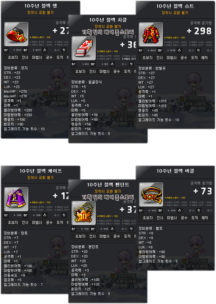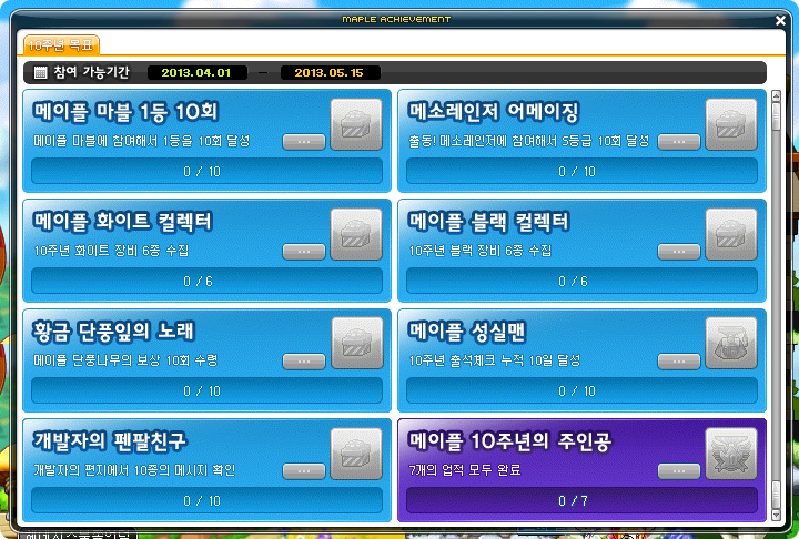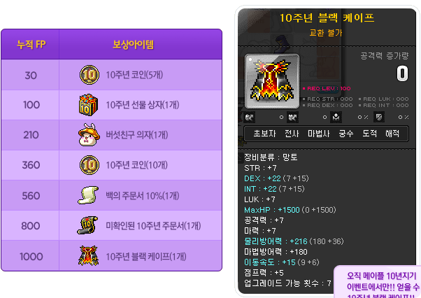 If you finish all 7 achievements, you’ll also get the Maple 10th Anniversary’s Master medal, which gives 10 to all stats, 100 HP and MP, and 10 attack and magic attack! However the attack and magic attack will expire in 30 days…