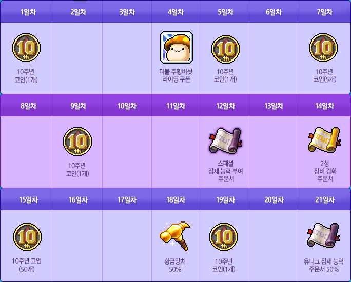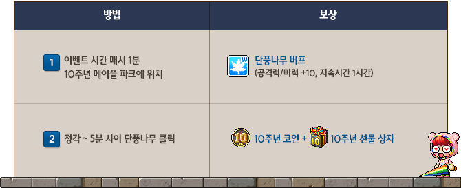 Every weekday at 4pm, 5pm, 6pm, 7pm, and 8pm, you will be invited to Maple Park! If you stay for one minute, you’ll get a 10 attack and magic attack buff for 1 hour. If you stay for 5 minutes, you’ll get a 10th Anniversary Coin and a 10th Anniversary Gift Box.