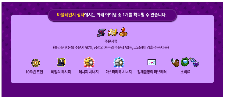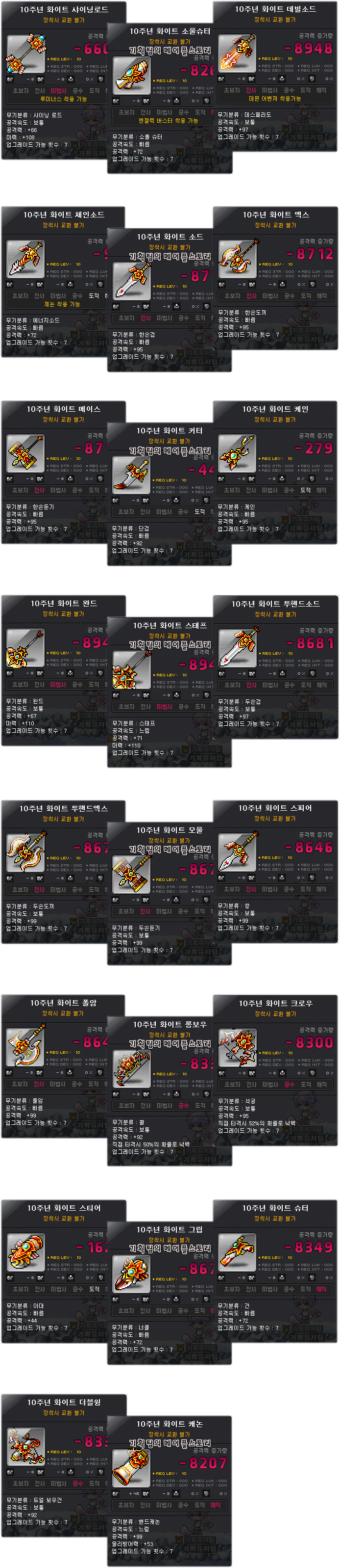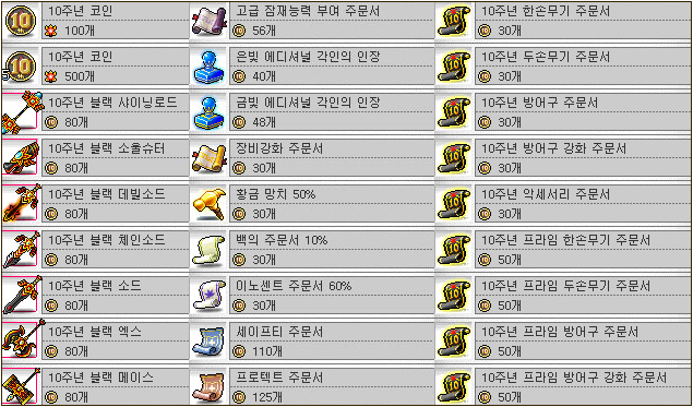 • 40% 10th Anniversary Prime One-Handed/Two-Handed Weapon Scroll (+10 attack and magic attack, +3 all stats, 30% chance of breaking if failed) (50 coins)