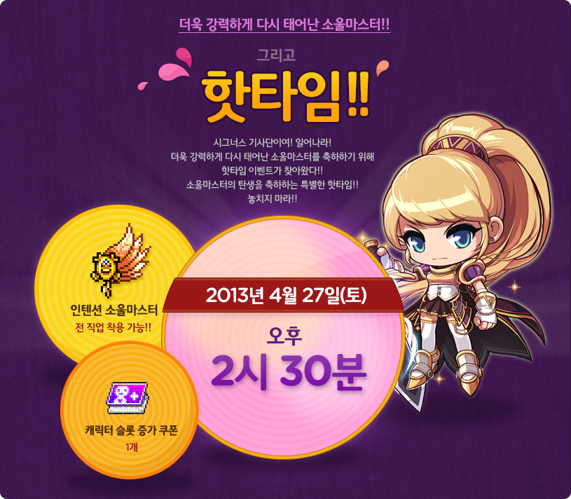 MapleStory has reached its 10th anniversary! To celebrate, a large patch has been released including the newly reorganized Soul Master (Dawn Warrior), two new theme dungeons, a new chat system, updated Cash Shop, and some other cool changes!