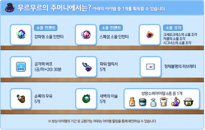 • Scrolls (50% Positive Chaos Scroll, 50% Miraculous Chaos Scroll, Advanced Equipment Enhancement Scroll)