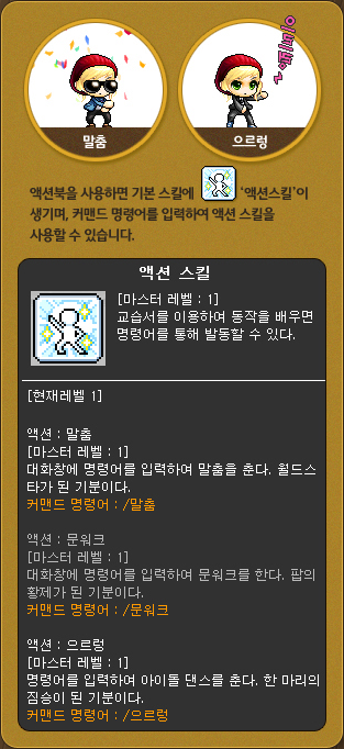 You might be wondering what an Action Book is. Well… if you use one, it will unlock the beginner skill Action Skill. This skill will, when certain commands are entered into the chat, cause you to dance! It’s like a special emote!