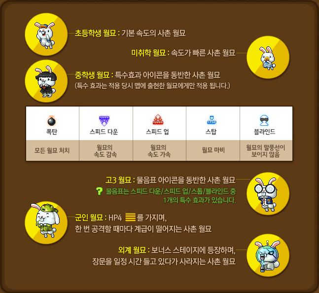 There’s also a bunch of special Moon Bunnies with different effects. For example, the second from above moves faster, the third from above drops a special buff (or debuff!) if you defeat it, and the soldier one has 4x as much HP!
