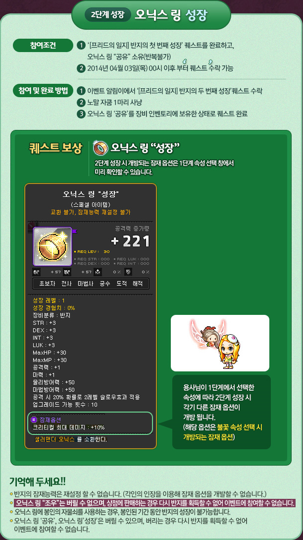 You can upgrade your “Share” ring to the Onyx Ring “Growth” after April 3 by defeating 1 Normal Zakum. Now, the ring will gain the specific stat I mentioned above, 10% to be exact (e.g. 10% critical chance increase, 10% boss damage, etc). These rings are like Dojo gloves in that their stats are given through ‘Special Potential’ and cannot be cubed.