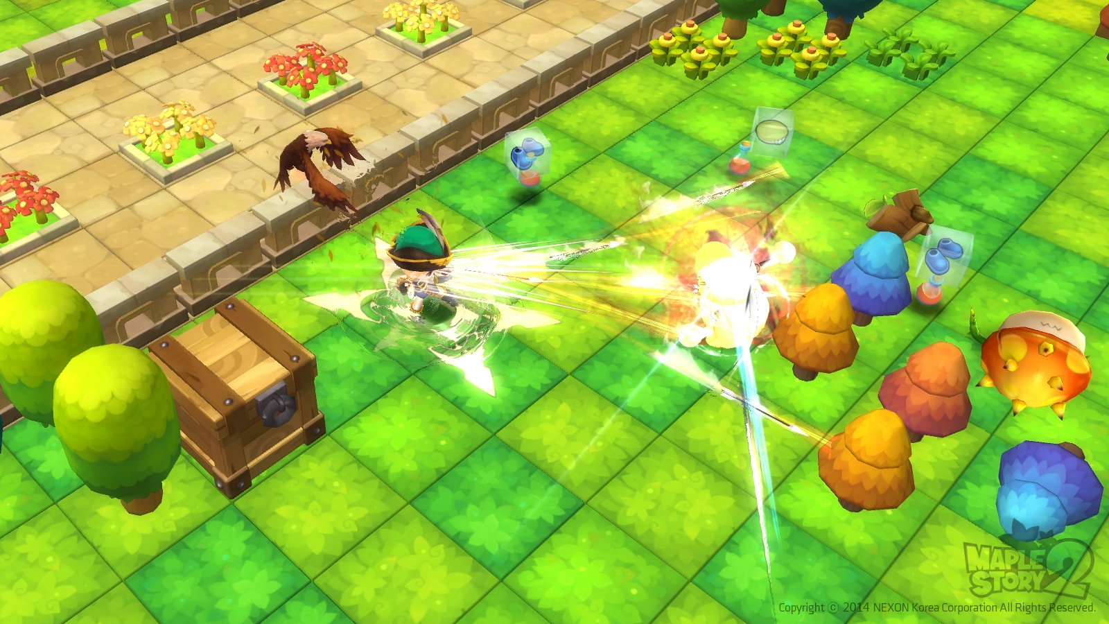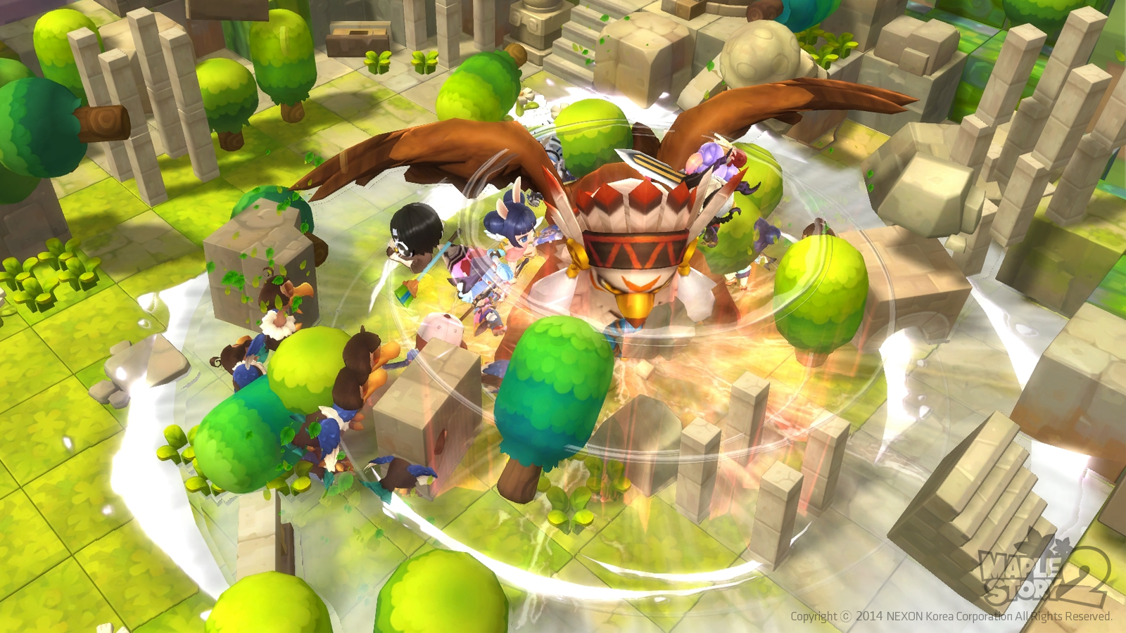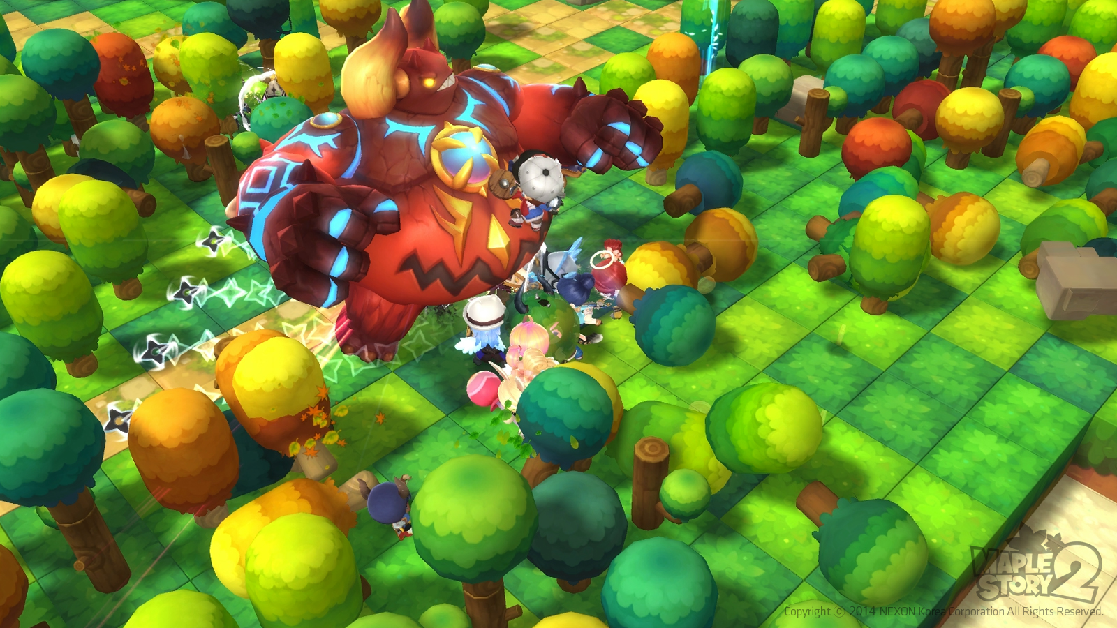 MapleStory 2 has boss monsters which appear while adventuring. Such battles require strategy and the need to move around while attacking. New bosses include Baphomet, Devlin, Urza, the Last Bajar, and Griffon.