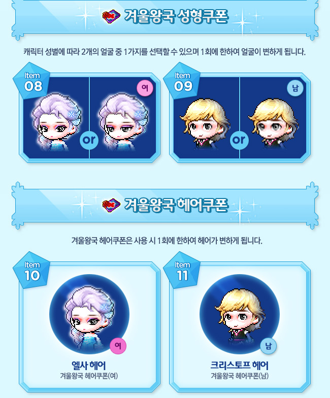 There’s also Frozen Eye and Hair Coupons. They’re both split into a male and female one, but the eye coupons can give you one of two different faces (of your choice I believe).