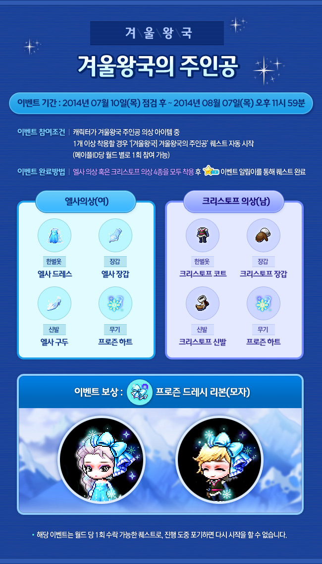 There are Cash items based off of characters from the movie, such as Elsa’s Dress, Gloves, and Shoes for female characters and Kristoff’s Coat, Gloves, and Shoes. There’s also a weapon called the Frozen Heart.