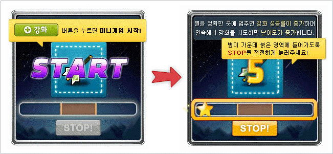 When you do decide to enhance your item and press the Enhance button, a minigame will begin! Stop the star inside the red band to raise the success rate of your enhancement!