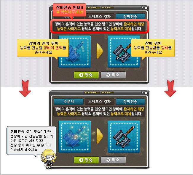 While you are enhancing, if you fail and your item is destroyed, don’t worry, Equipment Traces are here to help! Now, when an item is destroyed through enhancing, you’ll receive Traces of the equipment that was destroyed. These Traces will carry the item’s scrolled stats, additional options, potential (including additional potential), and the Soul information.