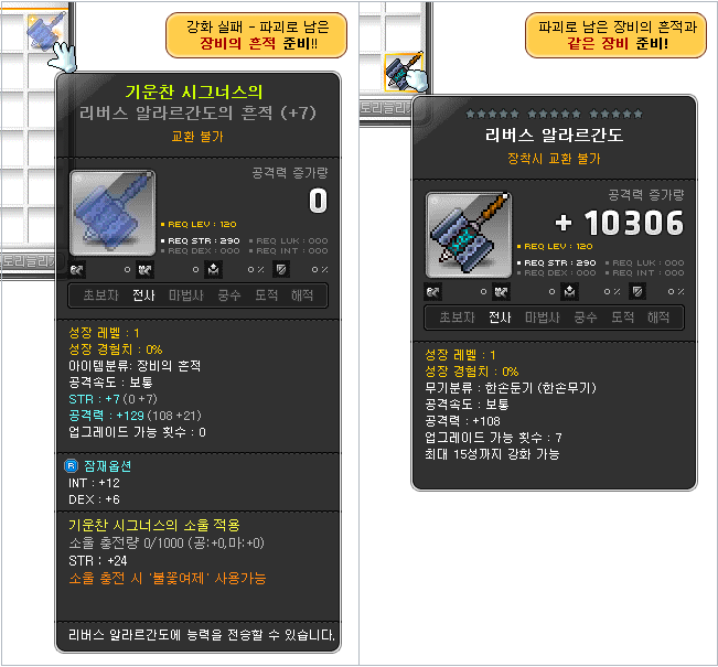 While you are enhancing, if you fail and your item is destroyed, don’t worry, Equipment Traces are here to help! Now, when an item is destroyed through enhancing, you’ll receive Traces of the equipment that was destroyed. These Traces will carry the item’s scrolled stats, additional options, potential (including additional potential), and the Soul information.