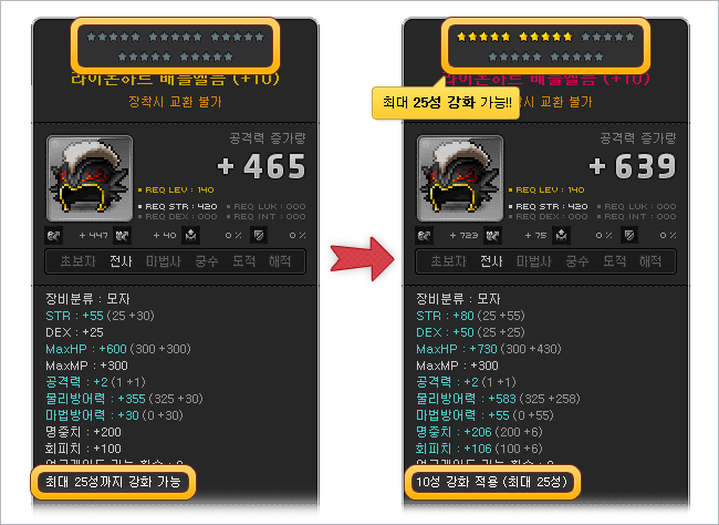 The maximum number of stars on an item have been raised from 15 to 25! However, this only applies to some items as the limit on stars is now based off of the item’s level. You can see any item’s maximum number of stars by looking at the tooltip, either the stars on the top or the note on the bottom.