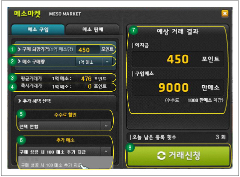 For those of you who don’t know, the Meso Market allows you to buy Maple Points with mesos or sell your mesos for Maple Points. The updated Meso Market comes with a fancy new UI that shows a lot more information than before, such as the fees you will incur.