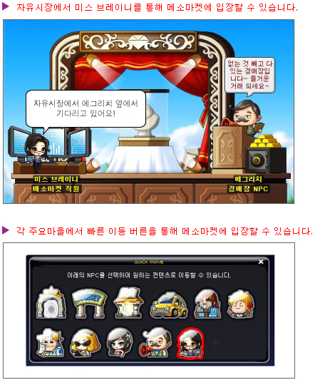 The Meso Market has been separated from the Auction House, and you can now access it by talking to Miss Brainy in the FM or through the Quick Move window.