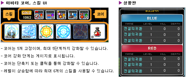 All the Avatars have the same Cores, which can be upgraded using Gold. Each Avatar also has unique skills which are unlocked as you level up. The bulletin on the side will show you everyone’s levels and current kills and deaths.
