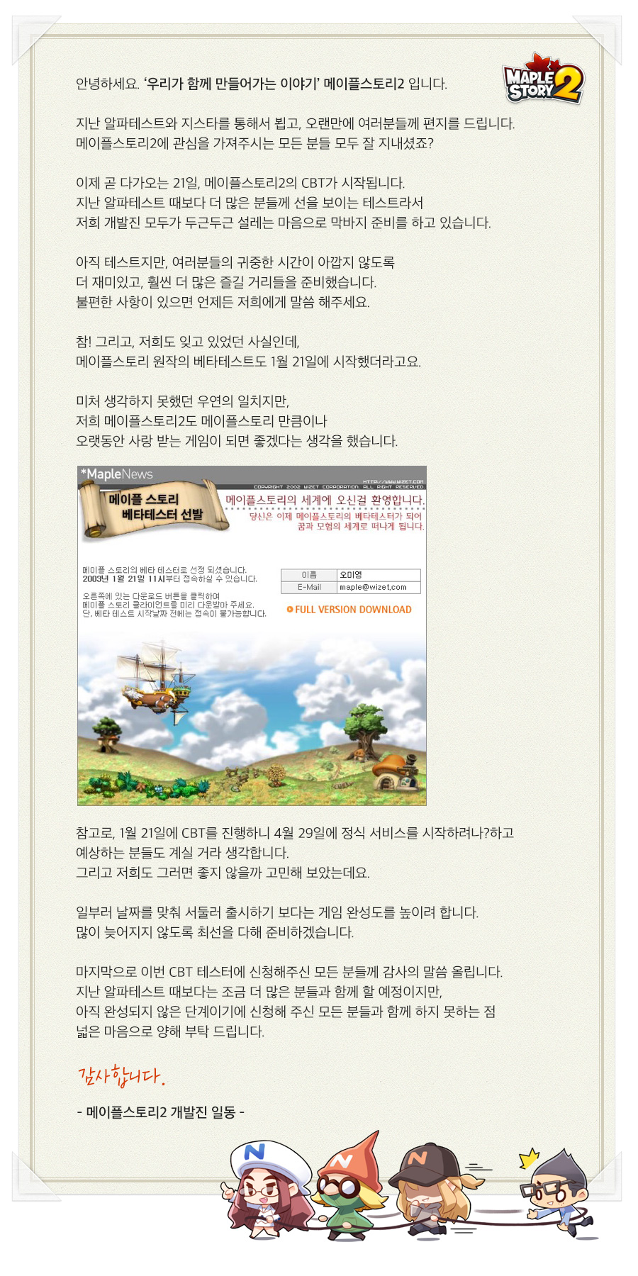 The development team also sent out this letter to everyone. I won’t translate it all but it talks about how happy they are that so many people have showed their enthusiasm for MapleStory 2 and that they will do their best to make it fun. It’s actually really cute haha.