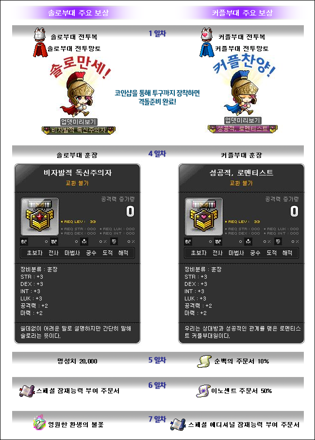 • 4 days: Involuntary Single/Success, Romanticist Medal (3 all stats, 2 attack and magic attack)
