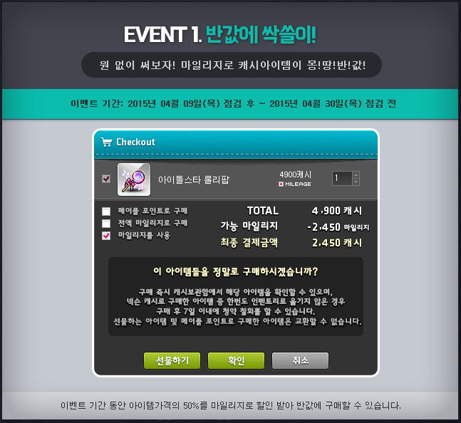 The last event for this patch is the Cash Item Half Off event, which runs from today until April 30. It’s actually a lot of events based on Mileage!