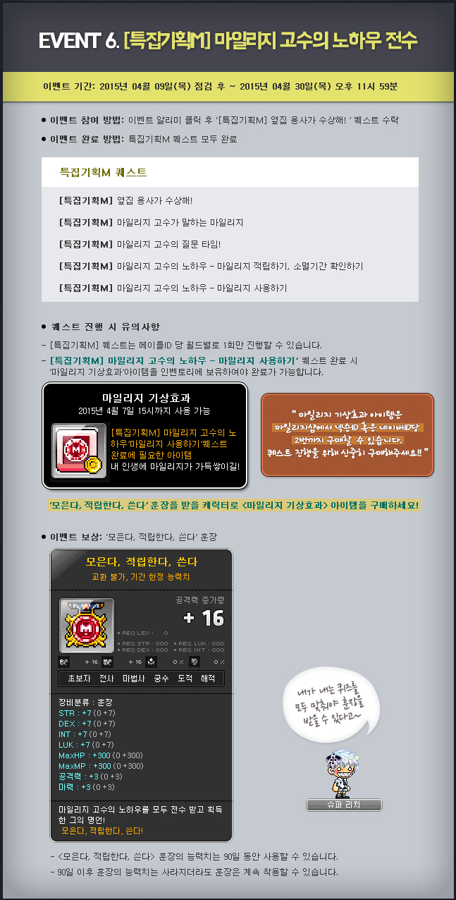 Finally, a Mileage Know-How quest line has been added to teach users about the benefits of Mileage. For completing this small tutorial, you’ll get the Play, Collect, and Spend medal which gives 7 all stats, 300 HP and MP, and 3 attack and magic attack (stats expire in 90 days).