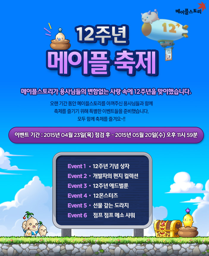 Today’s patch is celebrating 12 years of MapleStory! (wow that’s basically how long we’ve been waiting for 5th job since they revealed it at the RED conference!) A lot of events have been added and some game systems have been changed, including the Maple Guide, party quests, and hunting maps!