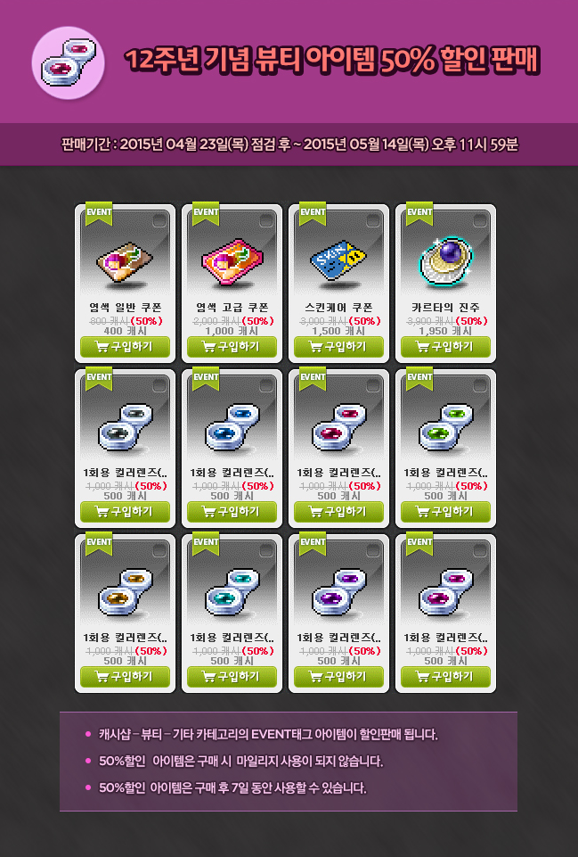 All items in the Etc. category under the Beauty section of the Cash Shop will be 50% off until May 14!