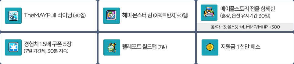 • Special items (Guide of Memories Ring (effect ring, expires in 90 days), Flame Suu Chair, Black Heaven Lover medal (5 attack and magic attack, 10 all stats, 500 HP and MP, stats expire in 90 days))
