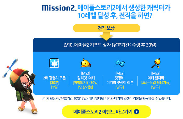 The other mission is to reach level 10 on that character and advance to a job. You’ll receive 1 30 Minute 2x Experience Coupon, an [MS2] Ducky pet (expires in 30 days), [Ms2] Ducky’s Ribbon pet equipment, and the [MS2] Ducky Candy Bar weapon (permanent Cash item).