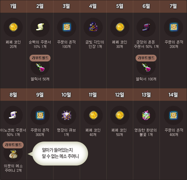 A new attendance check event has begun and will run until August 19. Each day you must defeat 200 monsters around your level to participate. The prizes are: