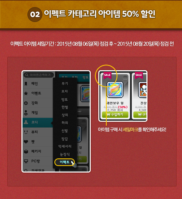 All items in the Effect category of the Cash Shop are on sale for 50% until August 20.