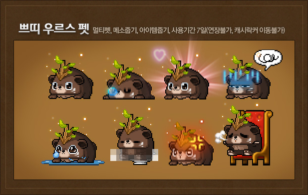 • Petite Urus Pet (Multipet, comes with meso and item pick-up, expires in 7 days, cannot be extended or put into the Cash Locker)