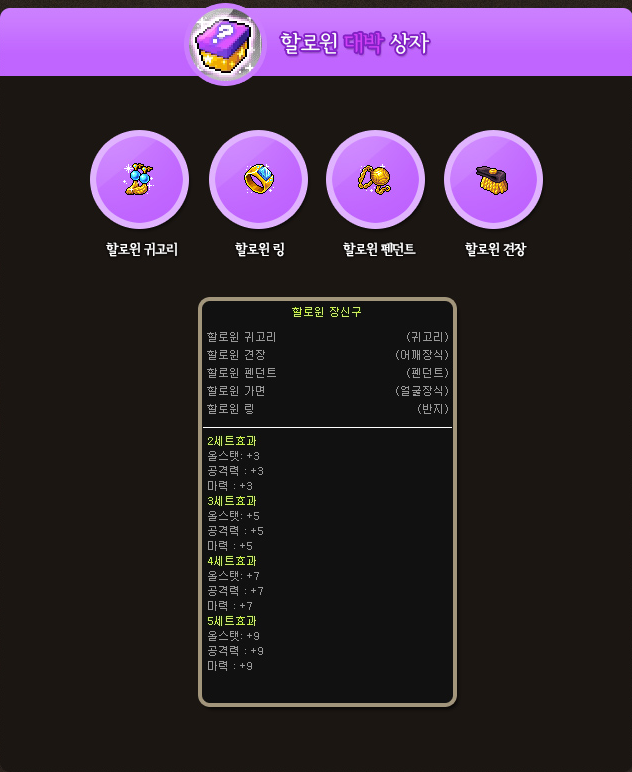 - Halloween Pendant (5 all stats, 1 attack and magic attack, 3 slots, level 75, untradeable)