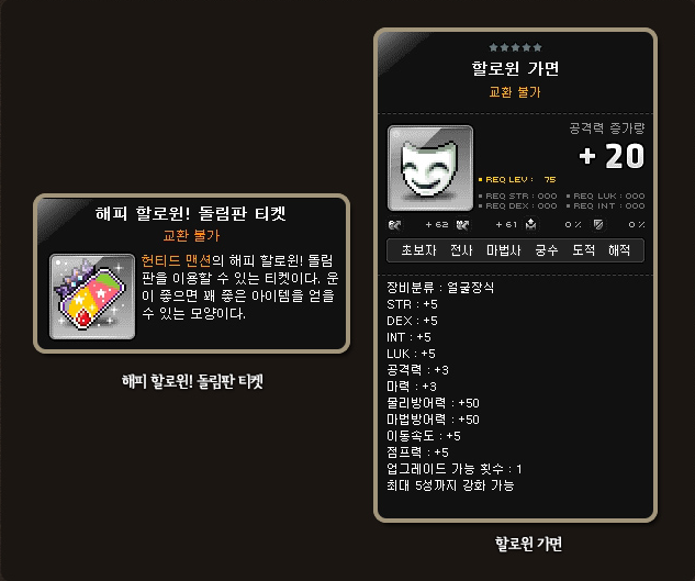 As you complete quests, you’ll receive Happy Halloween! Spin the Wheel Tickets. When you complete the last quest, you’ll get 10 more tickets and the Halloween Mask (5 all stats, 3 attack and magic attack, 5 speed and jump, 1 slot, untradeable).