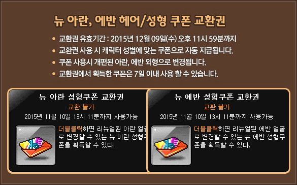 Home > kMS ver. 1.2.248 – Heroes of Maple: REBORN! > New Aran Evan Hair Face Coupons