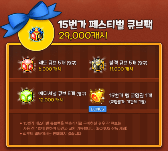 Home > KMS ver. 1.2.295 – MapleStory’s 15th Anniversary! > 15th Street Festival Cube Pack