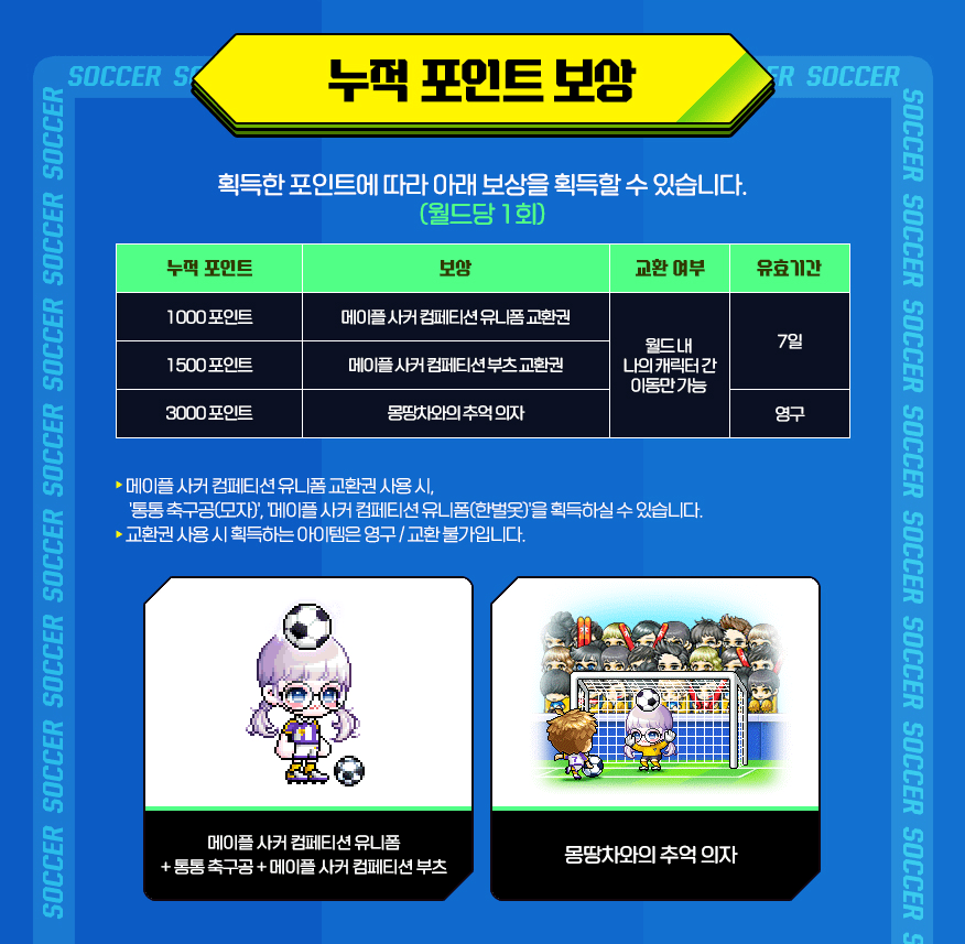 ※ When you use the Maple Soccer Competition Uniform Voucher, you will receive the ‘Bouncy Soccerball (Hat)’ and ‘Maple Soccer Competition Uniform (Overall)’.