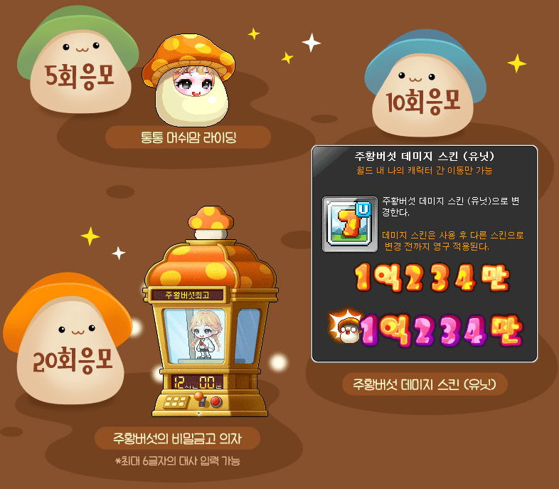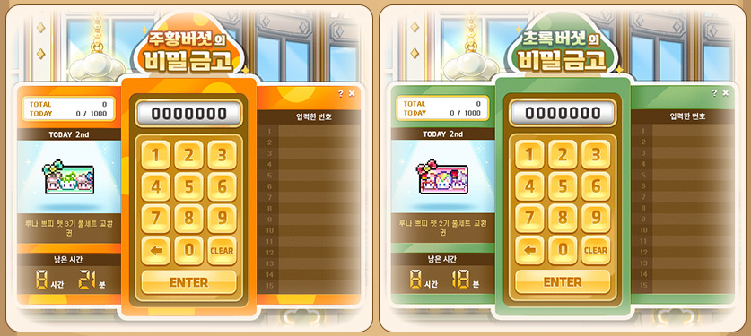 ※ You can participate 15 times for Orange Mushroom’s Secret Safe and 15 times for Green Mushroom’s Secret Safe.