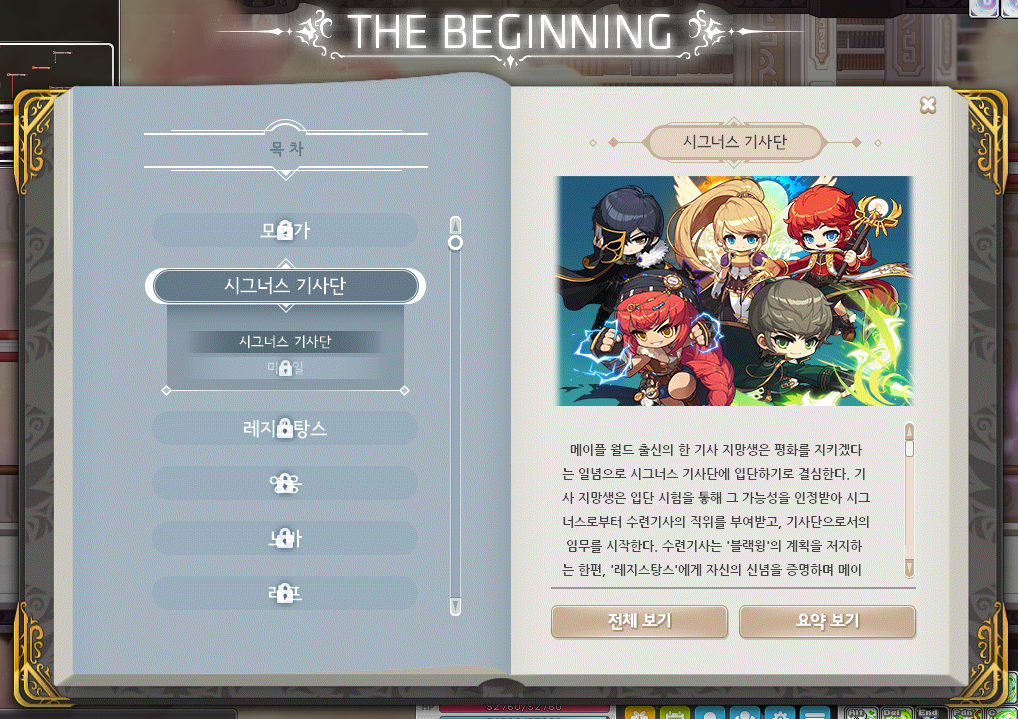 - The Book of the Beginnings contains the stories of the [Adventurers], [Cygnus Knights], and [Resistance] jobs. Other jobs will be added in a later update.