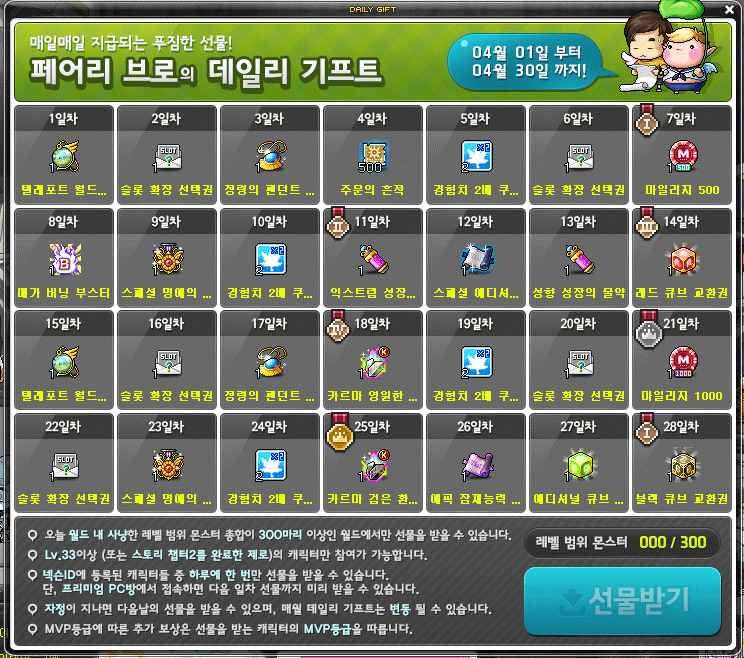 ※ On April 29, you can receive 500 Mileage and a Premium PC Room Hat Voucher when you have accessed the game for 180 minutes.
