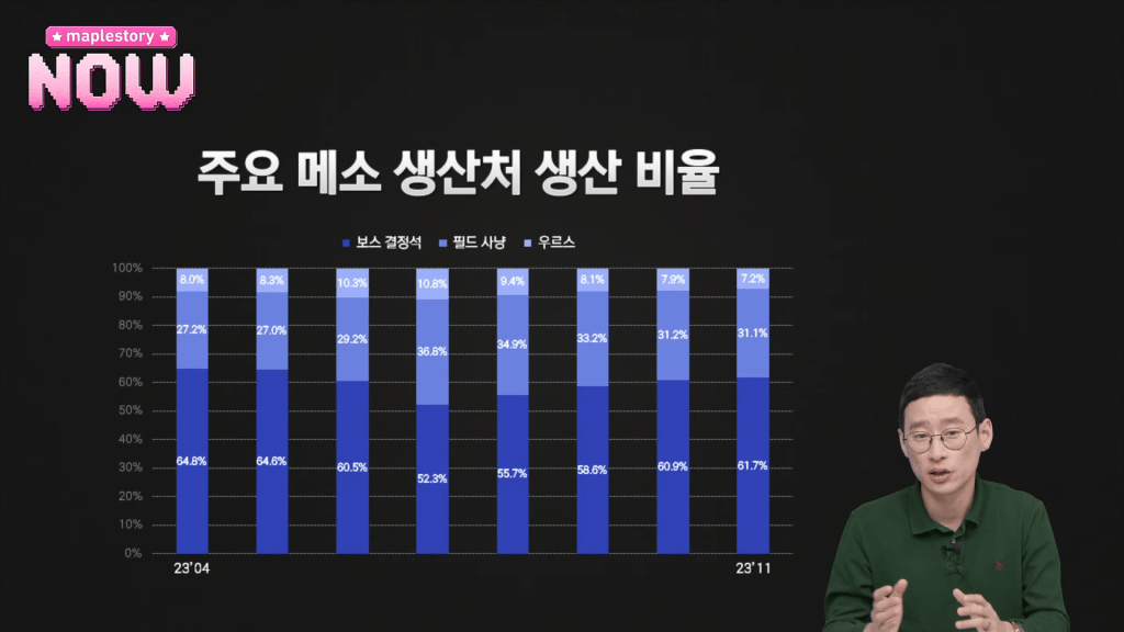 - The meso ratio has been consistently maintained at a ratio of 6:3:1 (boss crystals, grinding, Ursus). The ratio from hunting did increase after the 6th job advancement, which they thought would last longer, but it went back to normal shortly. Therefore, they decided to make changes to Boss Crystals.