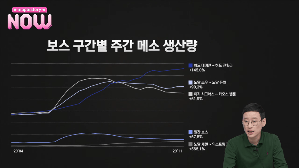 - Weekly Mesos Generated per Boss Groups (from top to bottom: Hard Demian ~ Hard Jin Hilla +145.0%, Normal Suu ~ Normal Dunkel +90.3%, Easy Cygnus ~ Chaos Vellum +61.9%, Daily Bosses +67.5%, Normal Seren ~ Extreme Kaling +568.1%)