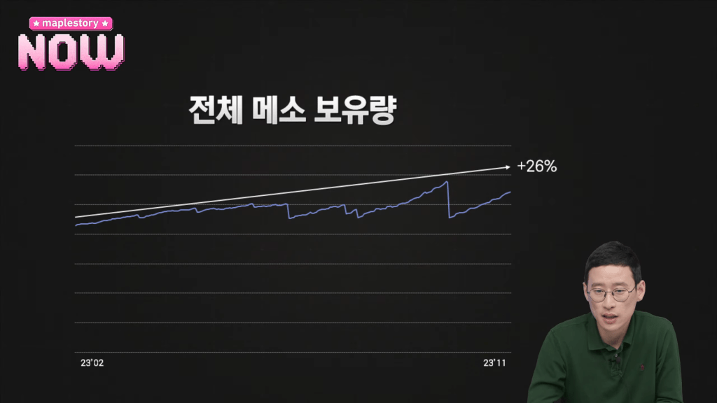 - He showed a few graphs while talking about the total mesos in the market, how they are generated, and the development team’s thoughts and decisions.