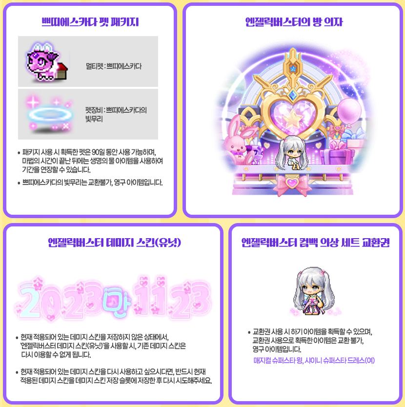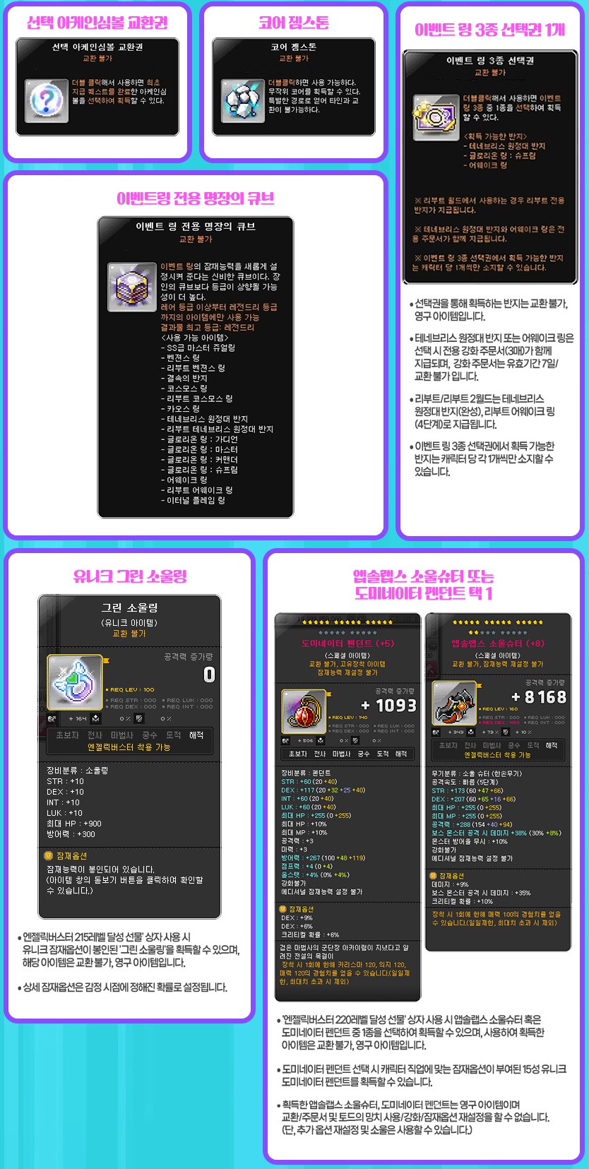 The Angelic Buster remaster has been released together with her new song ‘Shining Heart’! Together with this comeback is a support event for Angelic Buster characters as well as the return of (a vastly sped up) Yeti x Pink Bean World! To make the remastered skills clearer, I did full skill translations instead of just changes.