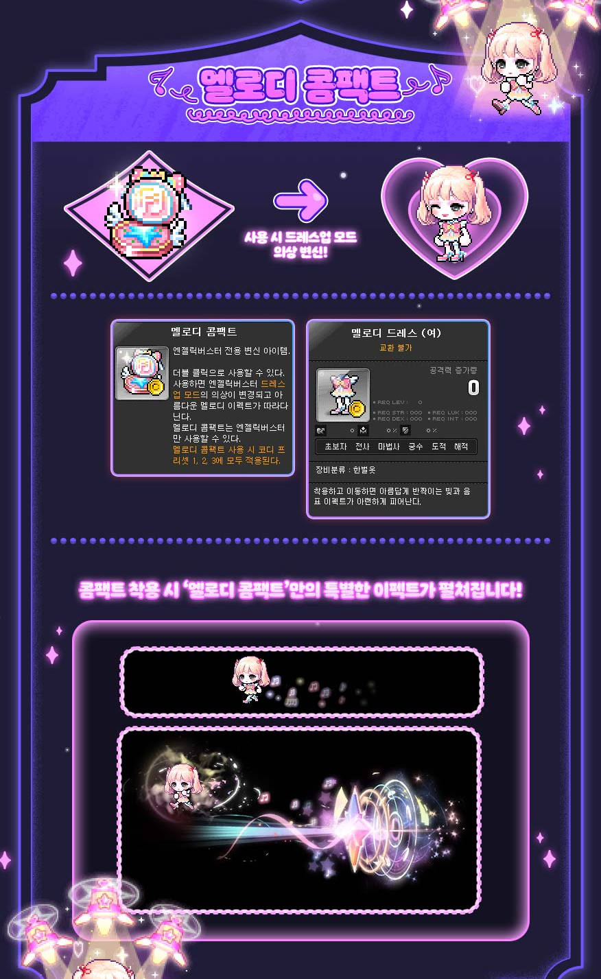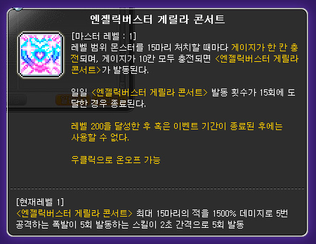 • On Stage: Hold a surprise concert. Nearby characters’ BGMs will be changed to Angelic Buster’s concert song. [Max Level: 1]