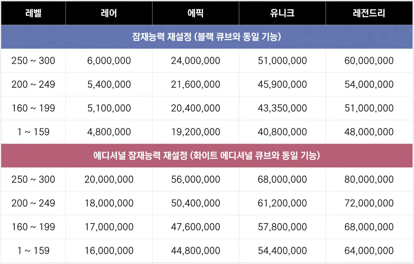 Previously, there were many types of Cubes, but now, there will only be a single form similar to Black and White Cubes, that allow you to choose between before and after, to remove the experience of becoming weaker. The potential reset costs will be based on the level and potential tier of an item. This will help preserve end-game equipment value while also improving the equipment growth experience to be a more gradual increase.