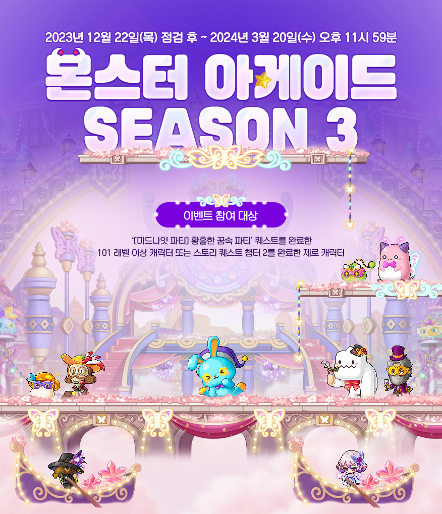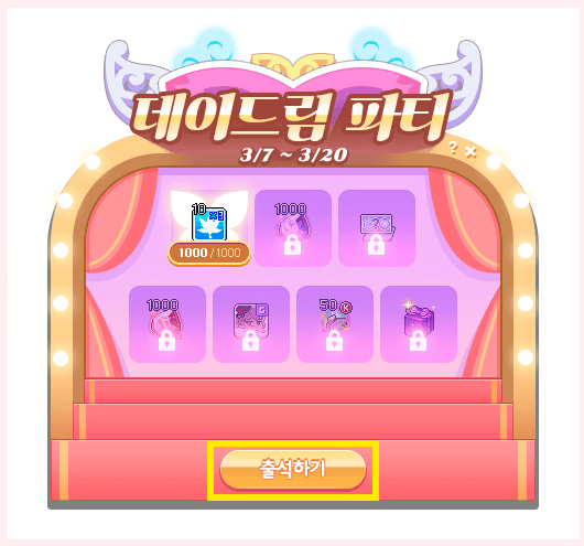 After defeating 1,000 monsters within your level range, you can click the ‘Additional Attendance Check’ button in the ‘Daydream Party’ UI to complete that day’s attendance check. After completing it, you can acquire 1 3x Experience Coupon (30 Minutes) which can only be put into storage and expires in 14 days.